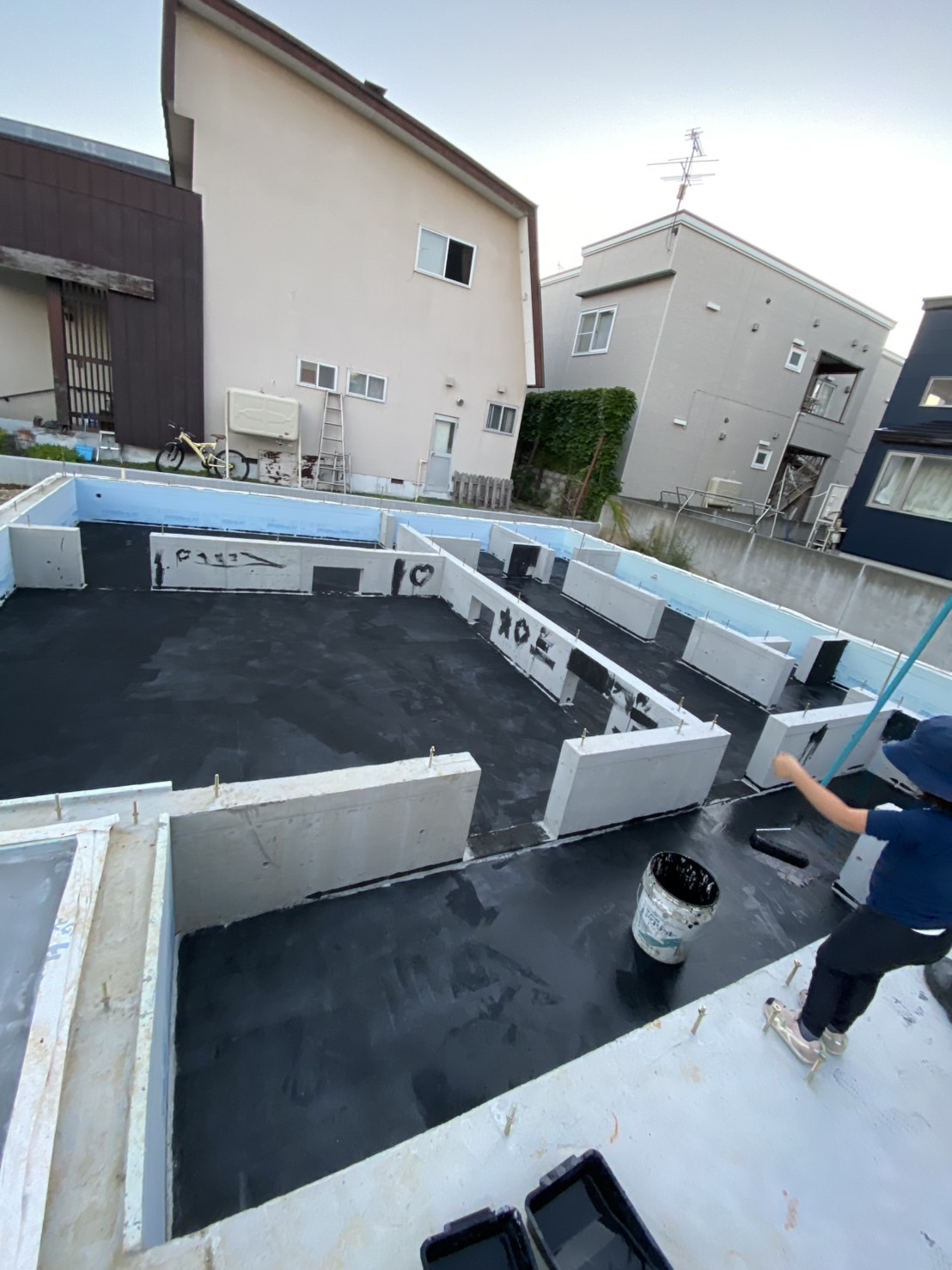 基礎ができたオーナー様が 床下に炭を家族で塗りました