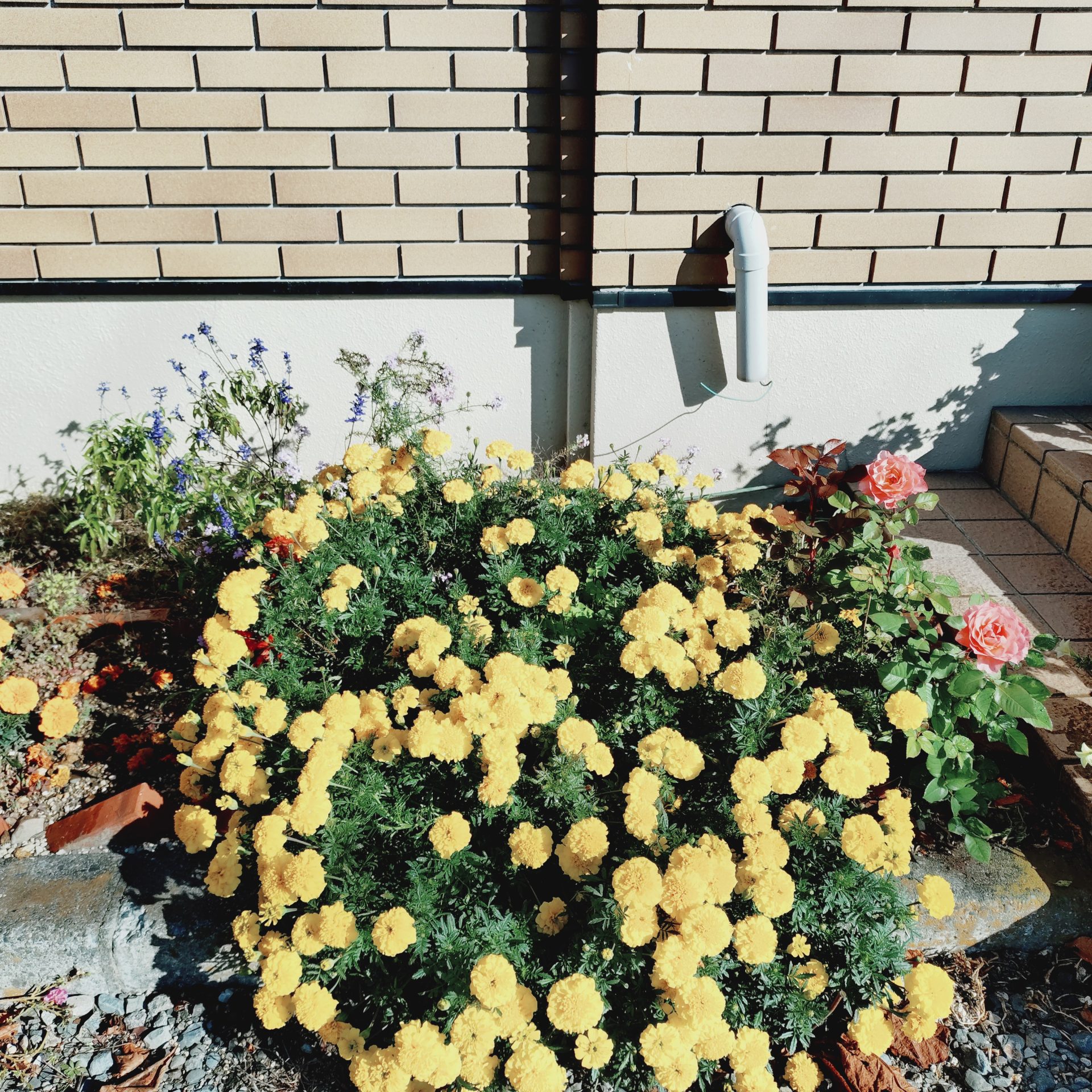 会社の前の花壇のマリーゴールドが直径1メートルくらいに成長しました(一株です)