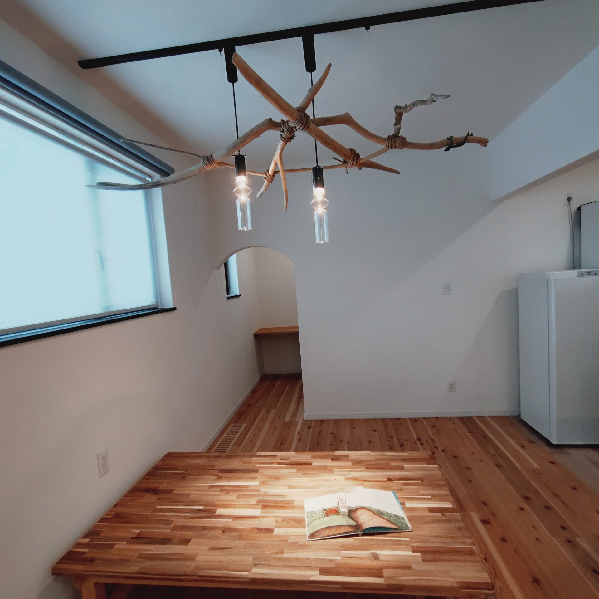 照明デザインもいたしました 食卓の照明です 海で流木を拾ってきて皮を剥いで作りました