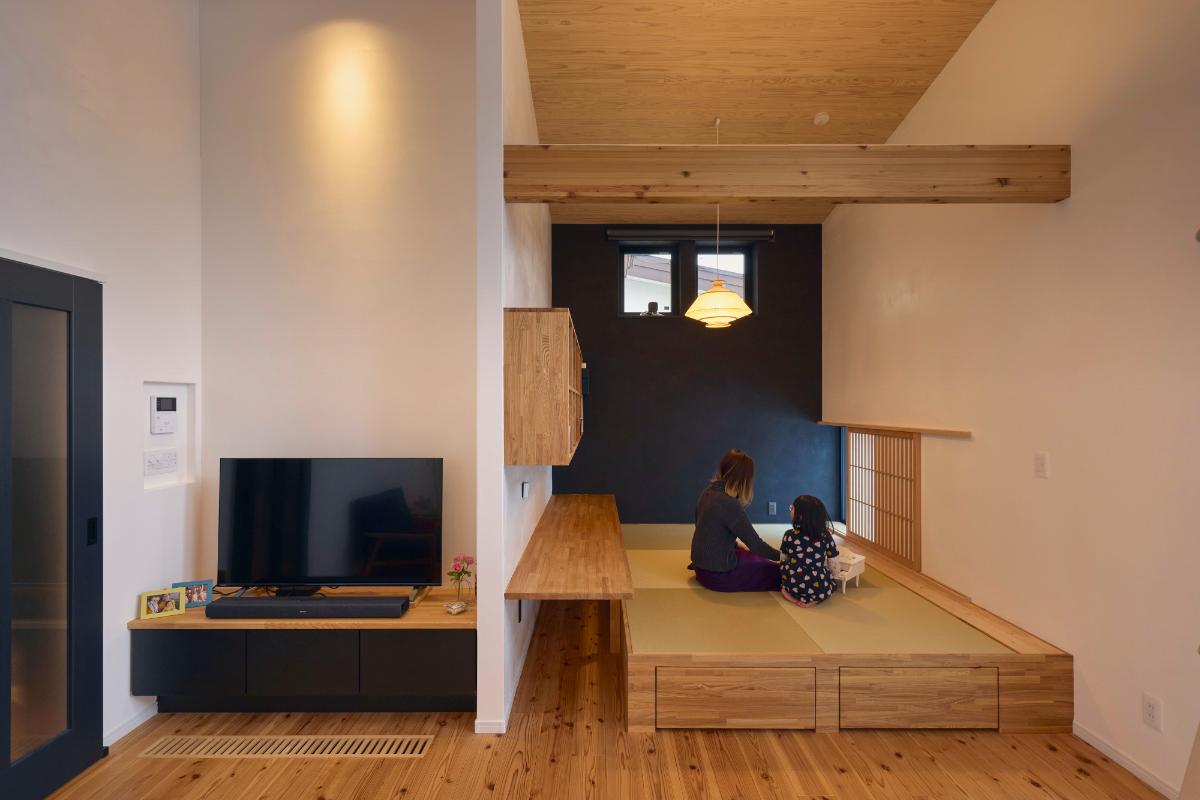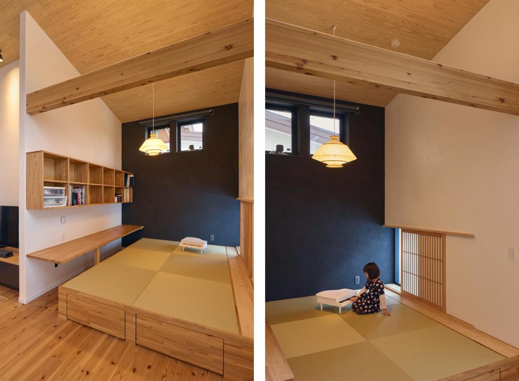 写真左/オープンタイプの和室には、造作のカウンターと棚をつけました。PC作業や裁縫、お子さんの学習など、家族が思い思いに利用できるフリースペースになっています。