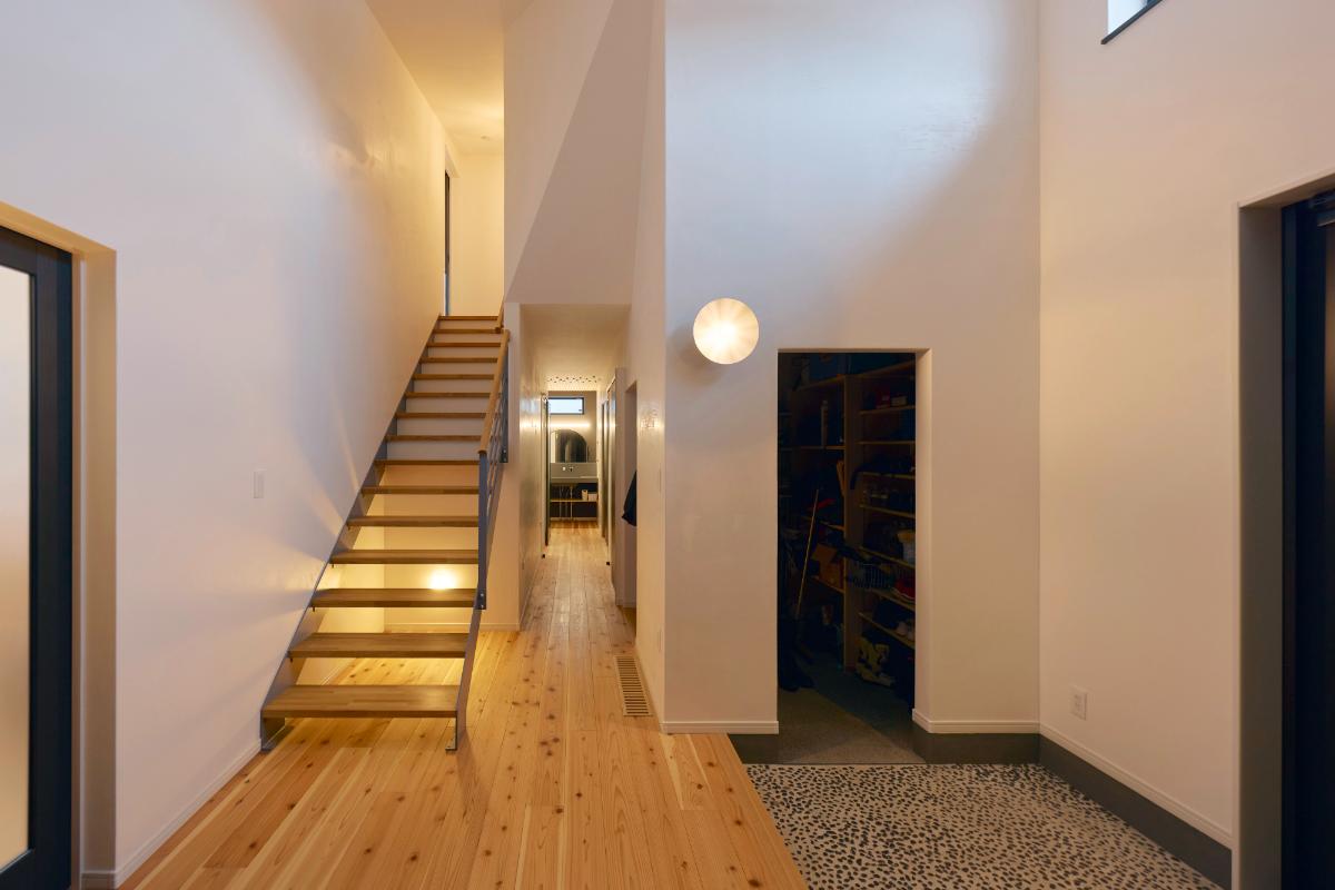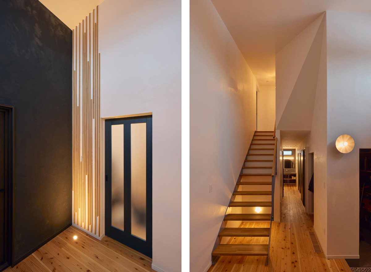 写真左/照明のプランニングも奥さまが行いました。玄関ホールはアッパーライトを使って印象的に。