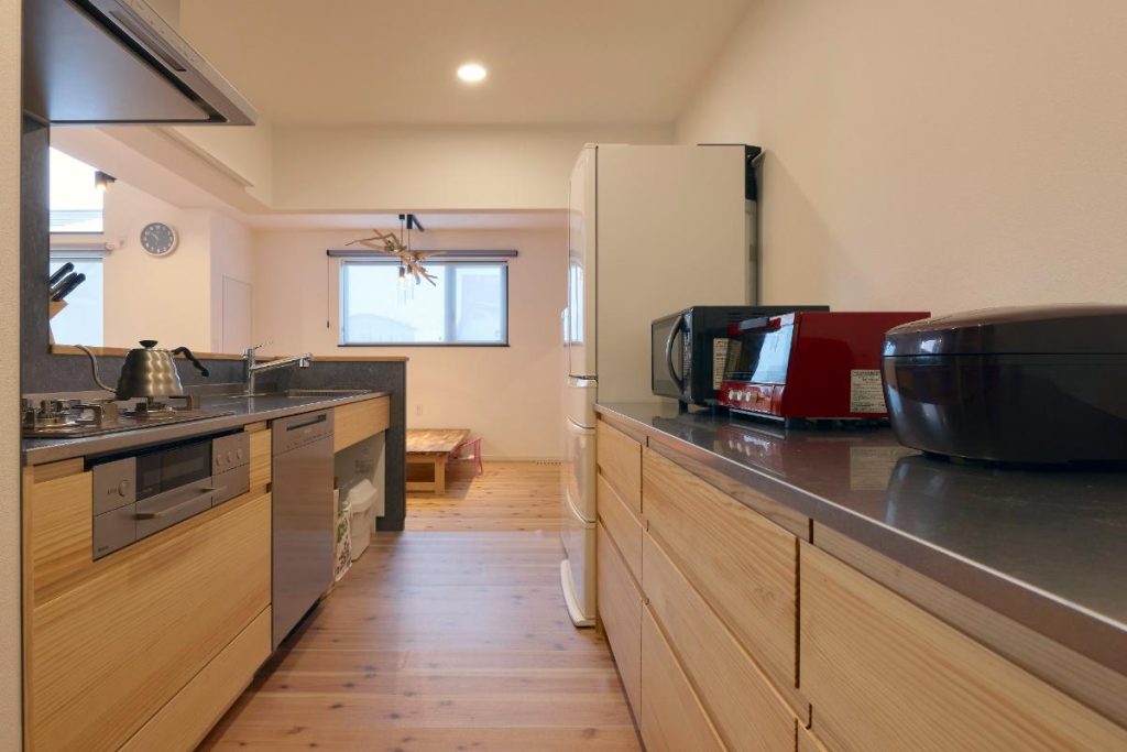 キッチンはウッドワン社の無垢の木を使ったシリーズから選びました。扉の面材は浮造り仕上げで、本物の素材ならではの豊かな表情が味わえます。