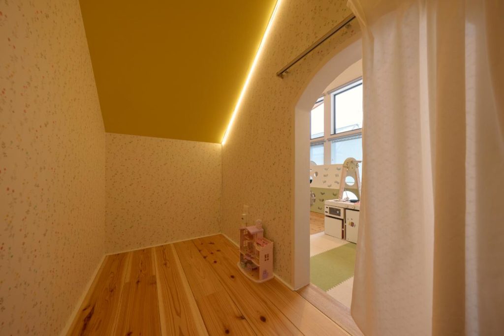 カーテンで仕切られたヌックがありました。こぢんまりとした内部は、お子さんにとって遊びの世界を広げてくれる小さな隠れ家。大人にとっても安らげる空間です。