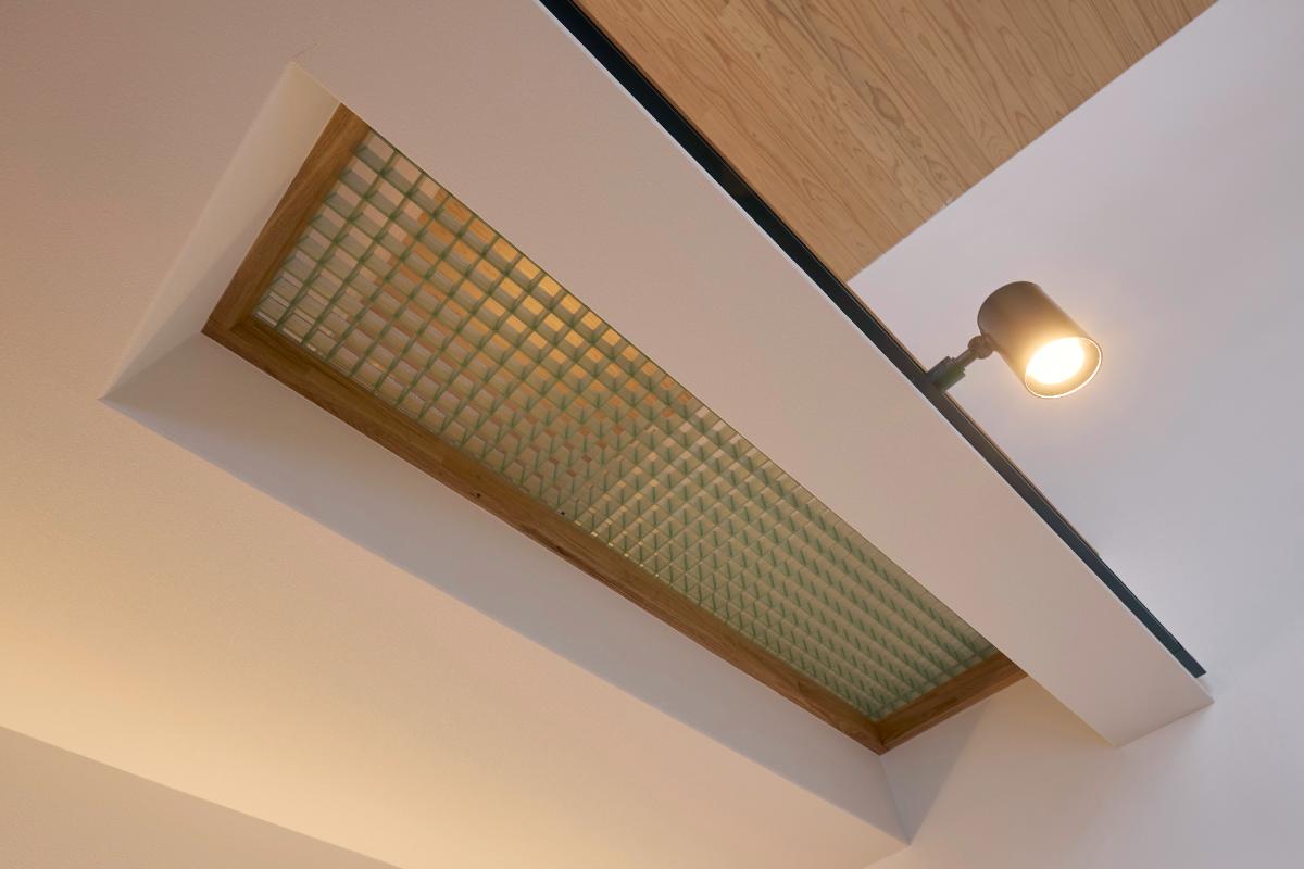 ホール端の床はFRP(繊維強化プラスチック)のグレーチングに。「1階のリビングにも西日が入るようにしたい」という要望を叶えました。