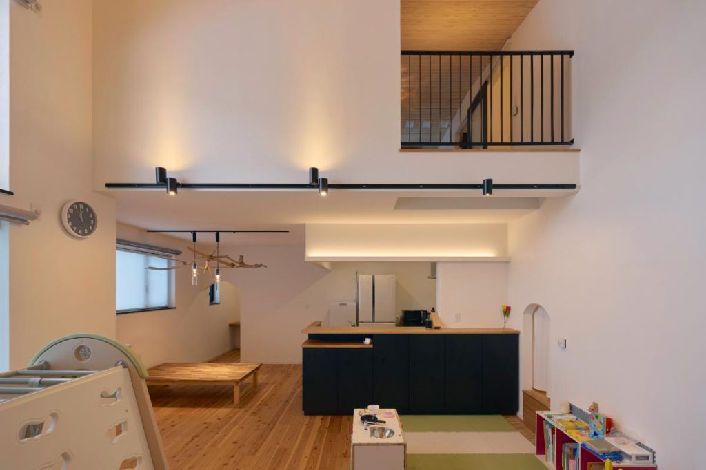 広々としたLDKに含まれるのは、和室コーナーだけではありません。お子さんのためのプレイスペースになっている一角(写真右手前)の隣には……
