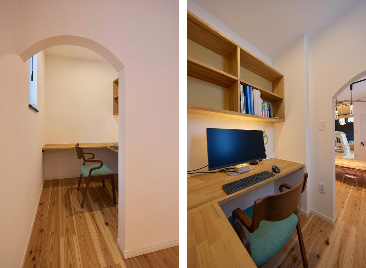 ダイニングの奥には小さな書斎も。L字型のデスクと本棚は造作です。高さを抑えた垂れ壁のアーチに包まれ、リビングとの距離感がちょうどよい空間になっています。
