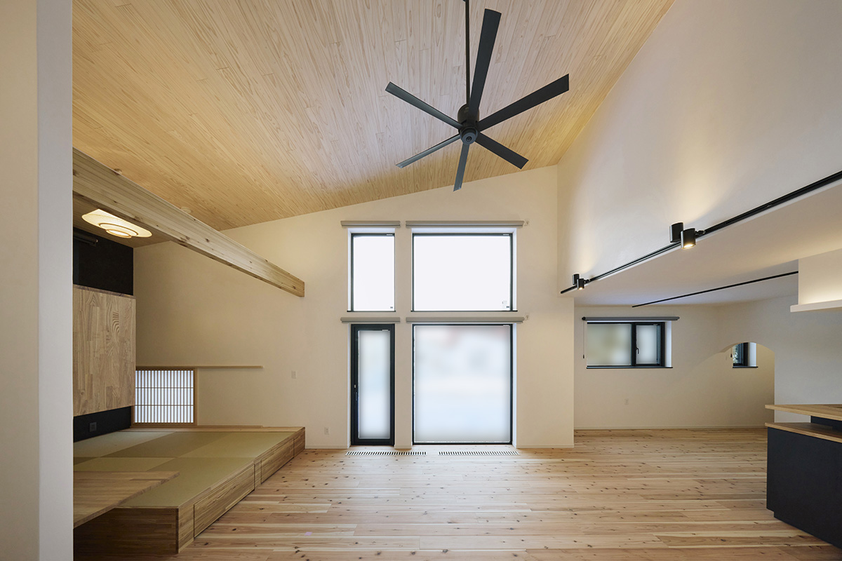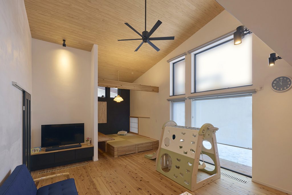 LDKの天井はスギの羽目板仕上げです。フローリングにもスギの無垢材を選びました。「踏み心地が柔らかく、熱の伝わり方も穏やか」なのだそう。
