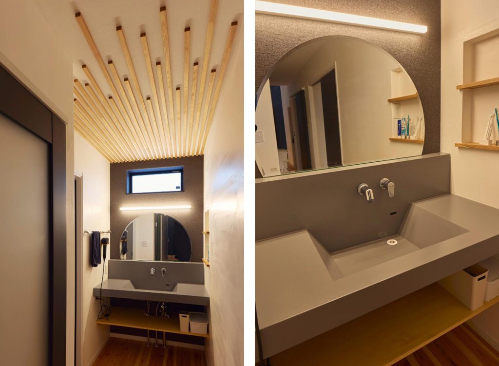 天井に玄関と揃いの木張りのデザインを施した洗面スペース。洗面台はミラタップ社の「エルフォルム」です。継ぎ目のない一体型のカウンターとハイバック水栓は、スタイリッシュなだけでなくお手入れのしやすさもポイント。鏡は奥さまがデザインしたものを特注した一点ものです。