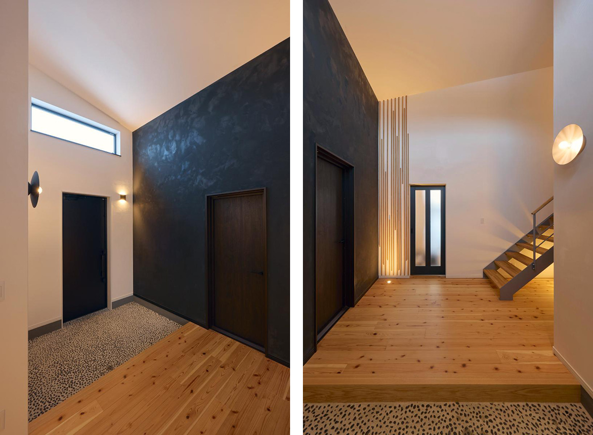 玄関は天井高4m、ホールと合わせると約5.5帖という広さ。洗い出しの土間に白と黒の漆喰壁で洗練された印象です。リビングドア横の木張りのデザインは奥様の考案。まるでホテルのエントランスのように格調高い空間になっています。