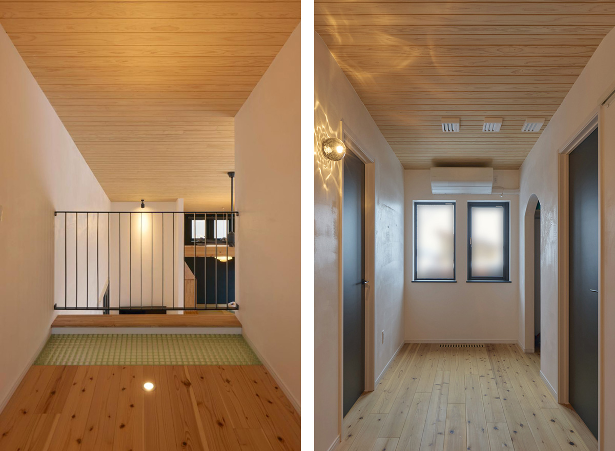 写真右/漆喰の壁は光を当てると陰影が際立ちます。廊下上部の壁を平面ではなく三角錐のような形にデザインしたことで、モダンアートのような造形美が生まれました。